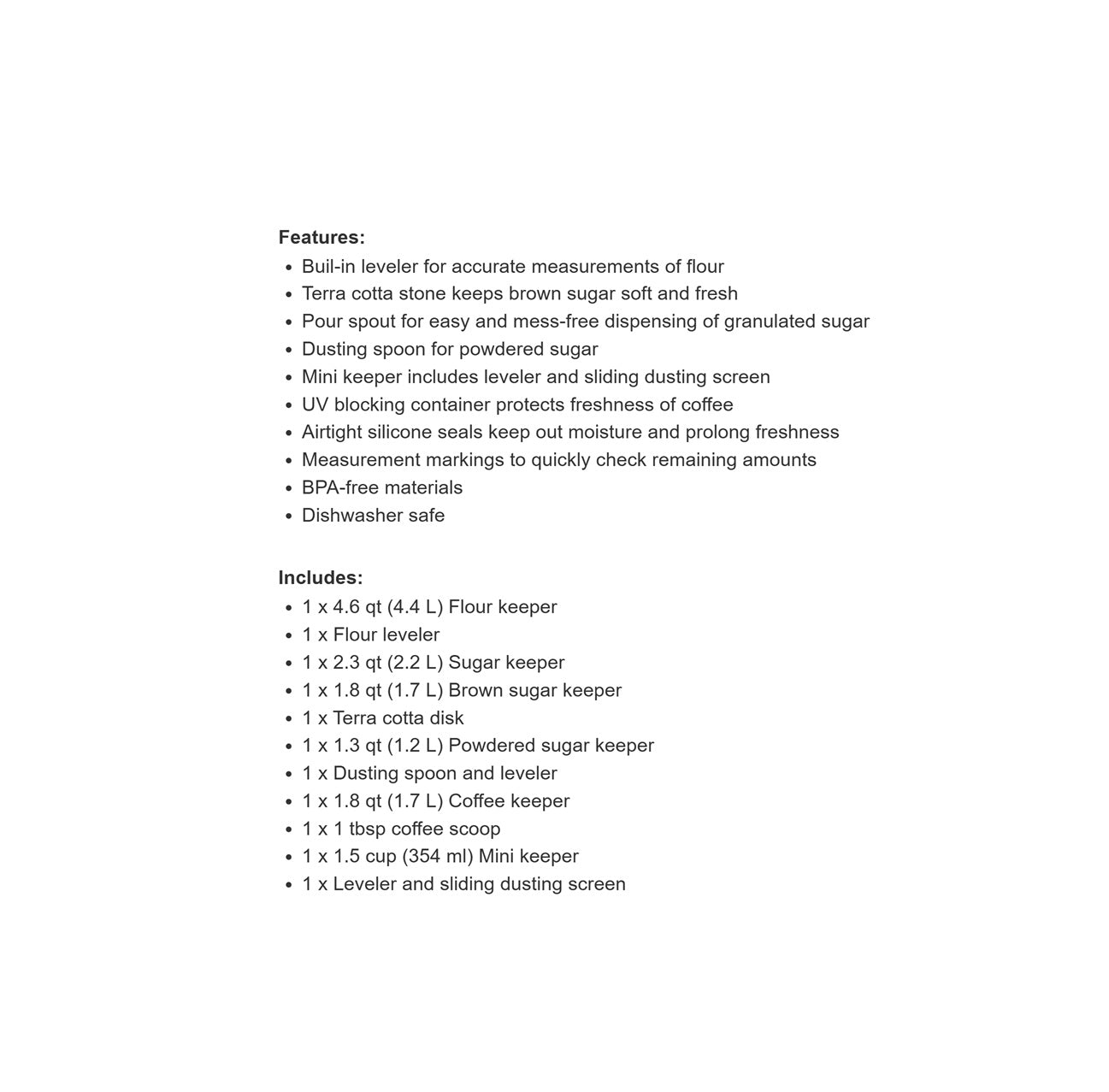 ProKeeper Bakers Storage Set, 6 containers + ProKeeper Bakers Storage Set, 6 containers - is currently on backorder. You may still purchase now though and we'll ship as soon as more become available. For actual quantity, refer to product title and description, if different from image