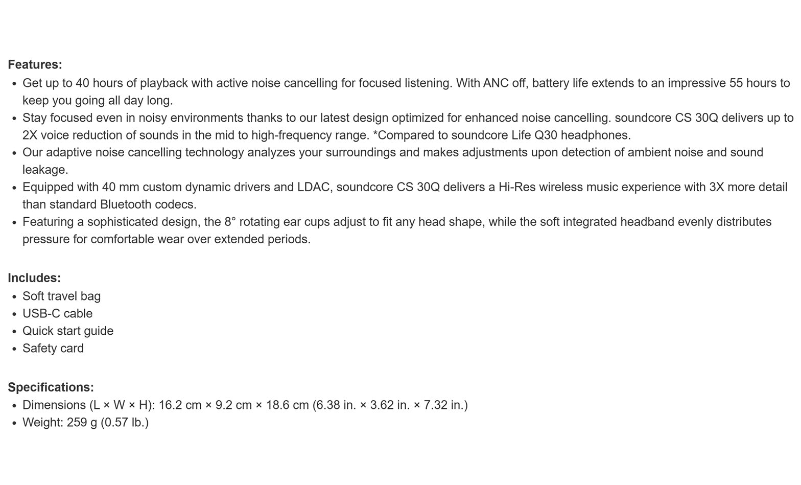 Soundcore CS 30Q Headphones, 1 headphone + Soundcore CS 30Q Headphones, 1 headphone - is currently on backorder. You may still purchase now though and we'll ship as soon as more become available. For actual quantity, refer to product title and description, if different from image