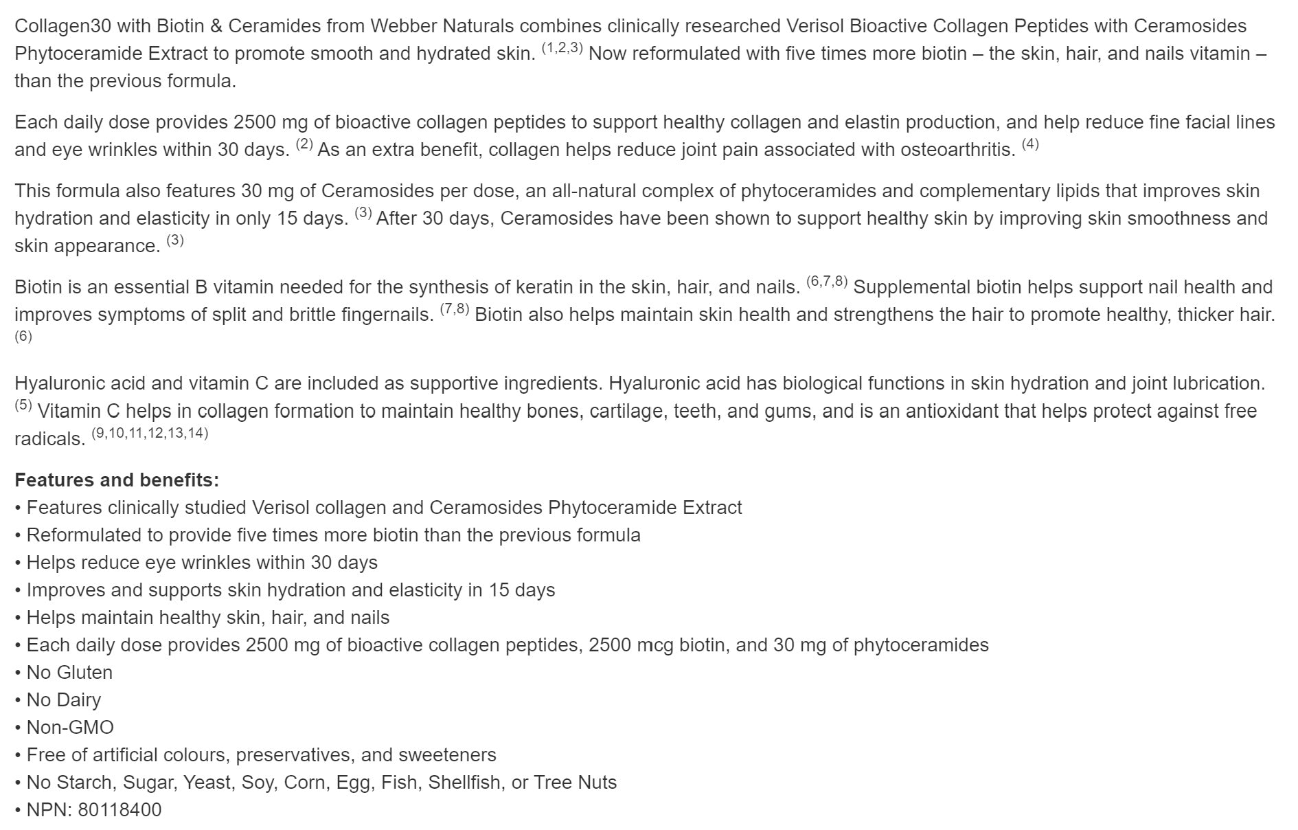 Webber naturals Collagen30 with Biotin & Ceramides , 200 Tablets - is currently on backorder. You may still purchase now though and we'll ship as soon as more become available.