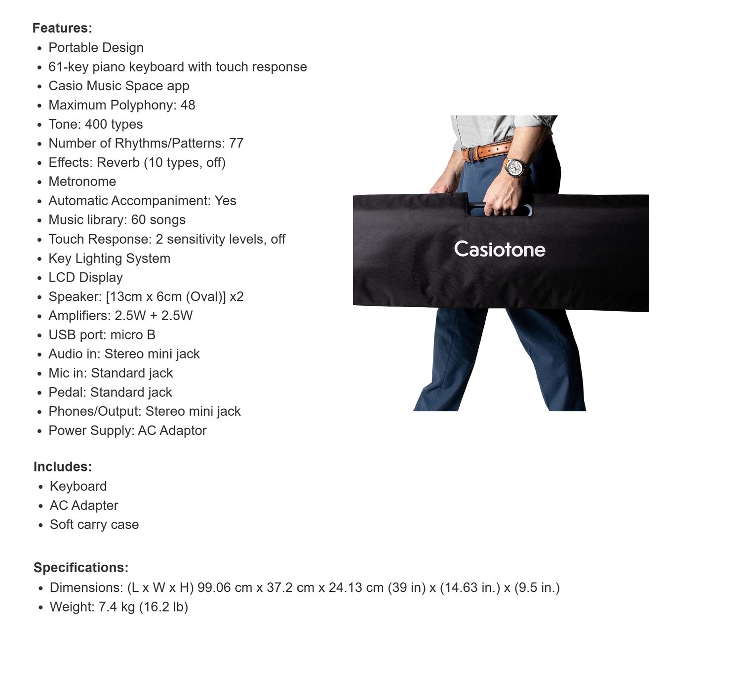 Casio Digital Keyboard, 1 keyboard + Casio Digital Keyboard, 1 keyboard - is currently on backorder. You may still purchase now though and we'll ship as soon as more become available. For actual quantity, refer to product title and description, if different from image